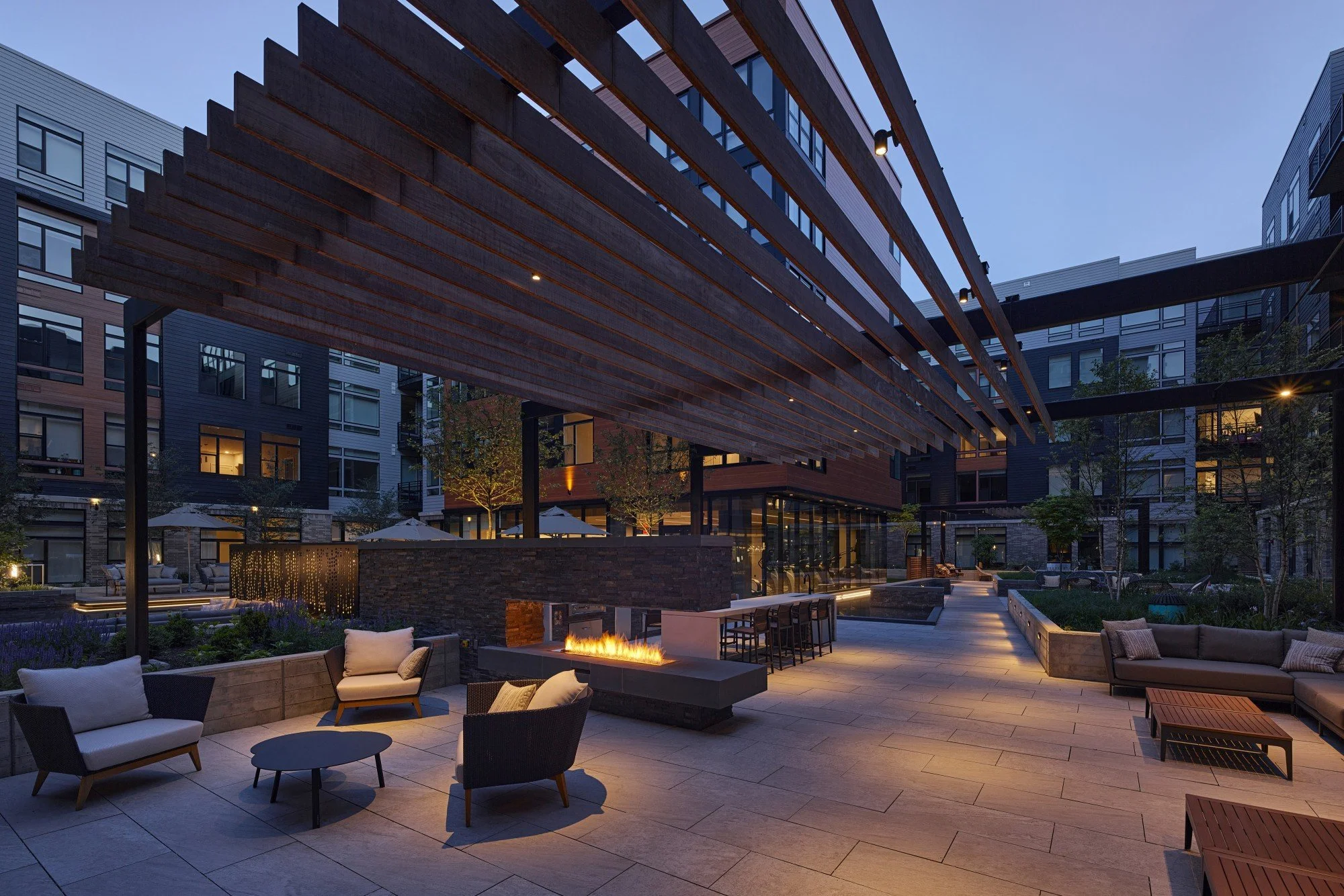 Arrowwood consists of over 200 apartments and amenity spaces. The building’s main entry and amenity spaces front a public green, and the façade is pulled back and opened to link the public green space to the interior courtyard. The façade materials are composed to create a dynamic frame acting as a large-scale urban window facing the public green. The building design features a central courtyard organized around a projecting wing in the center containing the fitness and wellness areas with the units above.